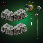 Verticality is this bundle's strong suit, prioritizing the monstrous Escarpment pieces ability to build on top of each other to great effect. With small adjustments, this bundle can go from a densely escalating 2'x2' build, to a more spread out 3'x3' with the same pieces! As an added bonus, the scatter options included help bring out the danger and the functionality of the various accessory holes inside this entire system.