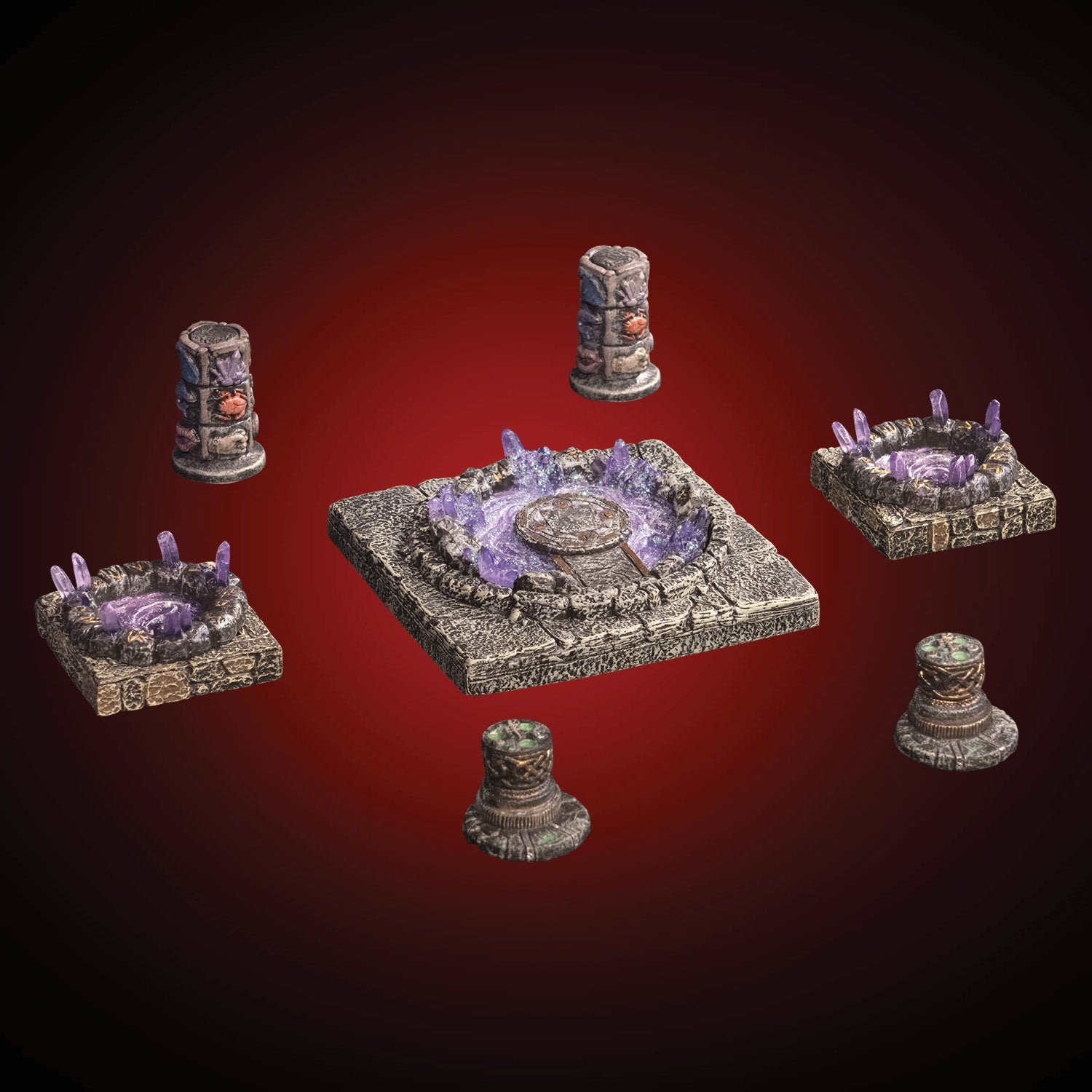 Add puzzles, intrigue, and magic to your encounters with this eye-popping collection of narrative pieces. The 4"x4" Dungeon Pool is a perfect centerpiece for a humble shrine or dungeon temple, then add the Magic Pool insert inside to transform it into a mystic scrying pool or wizard's circle. The Magic Pool insert can also be used as freestanding scatter outside the Dungeon Pool. A pair of purple Portal - Trapdoor Inserts pop into the included Trapdoor Floors to create teleporters anywhere in your build. Use the Cryptic Key Pedestal and Riddle Pillar to design puzzles and skill challenges for your players.