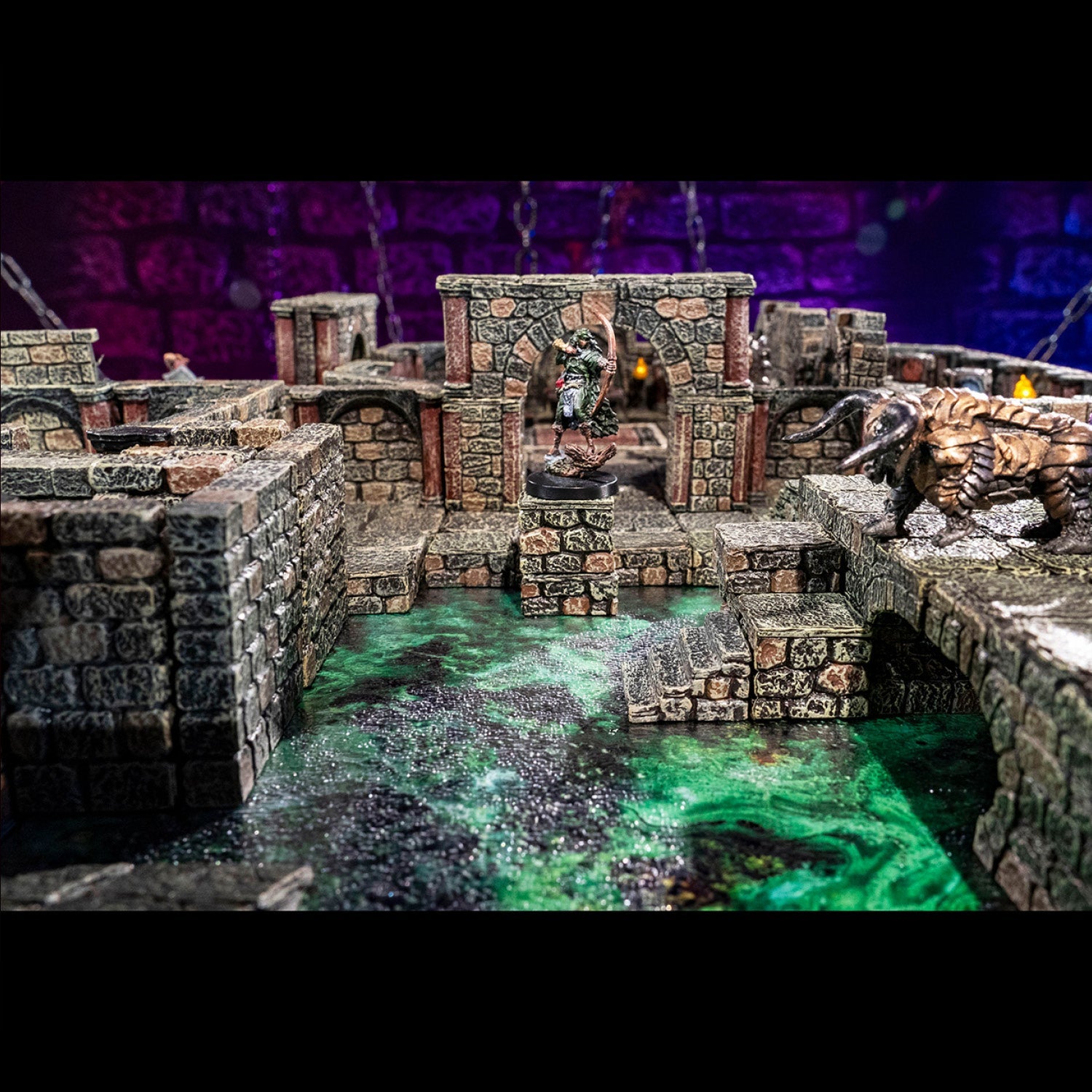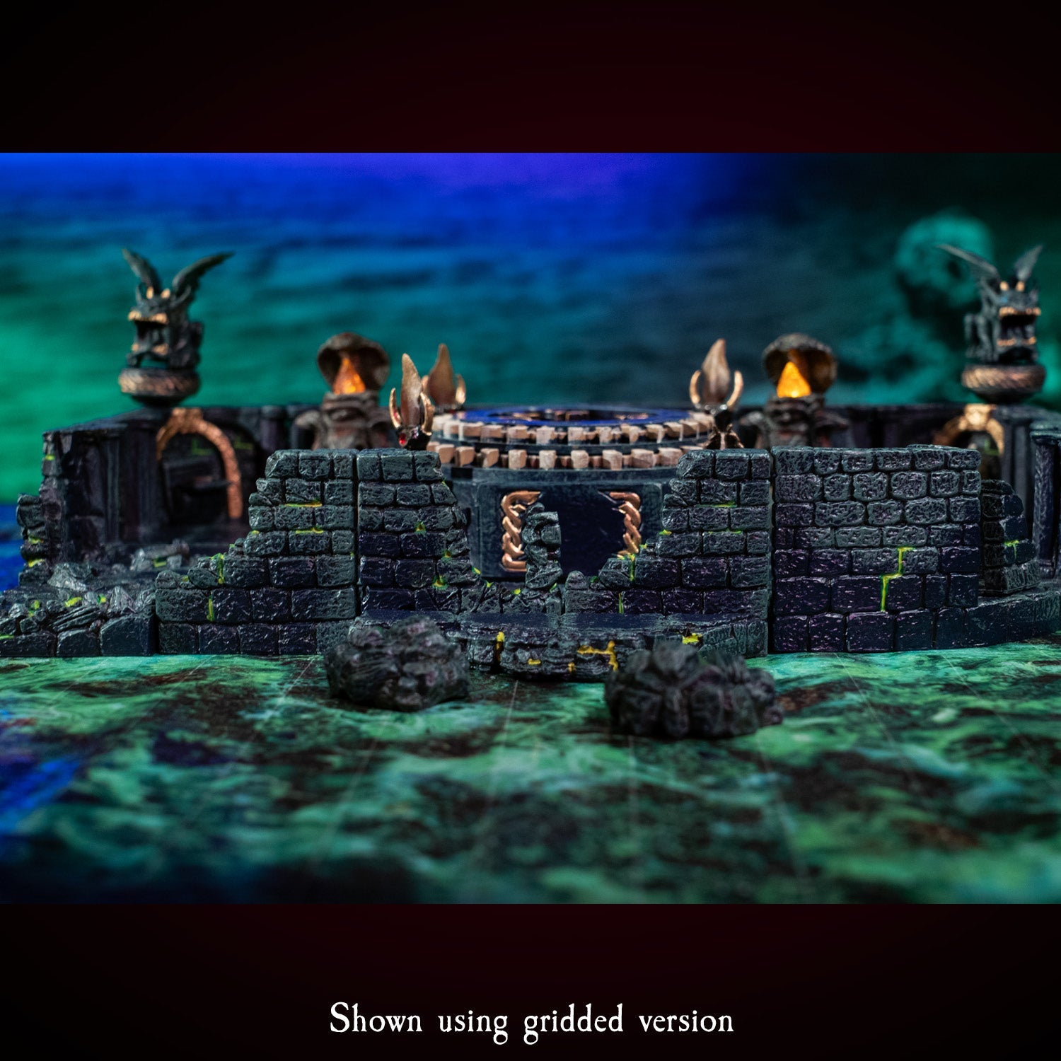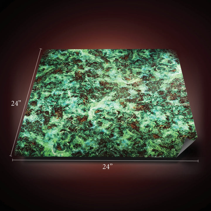 A two foot square, roll-up mat perfect for expansive negative space builds and gives fantastic coverage for the price. The graphic features a mass of caustic green goo, and the surface of the mat has a rippled texture that catches the light creating the illusion of real liquid. Ideal for building ruins flooded by acid, or a toxic spill inside your dungeon. The graphic is gridless so you can enjoy the artistry without interruption.