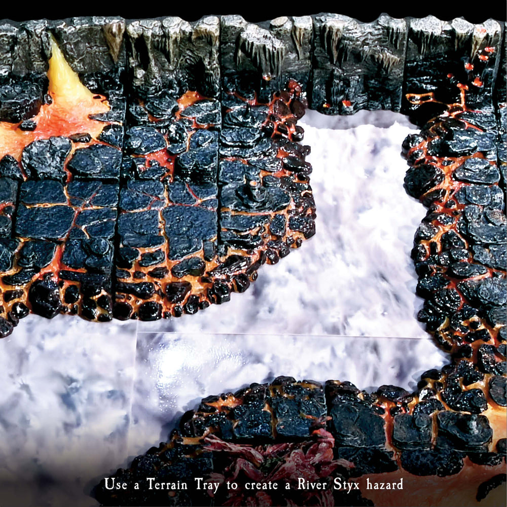 Build around your Terrain Tray with banks, ledges, or any sculpted floors and the remaining exposed area creates a “negative space” hazard such as a lava flow, or river. This is a fast and easy way to create a wide variety of challenges and eye-catching centerpieces. And by swapping out the Terrain Tray you can instantly transform a pond into a pool of acid or pit of necrotic sludge.