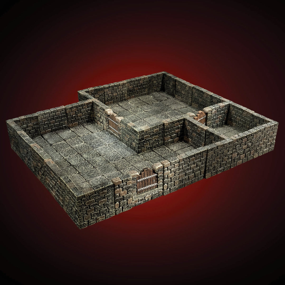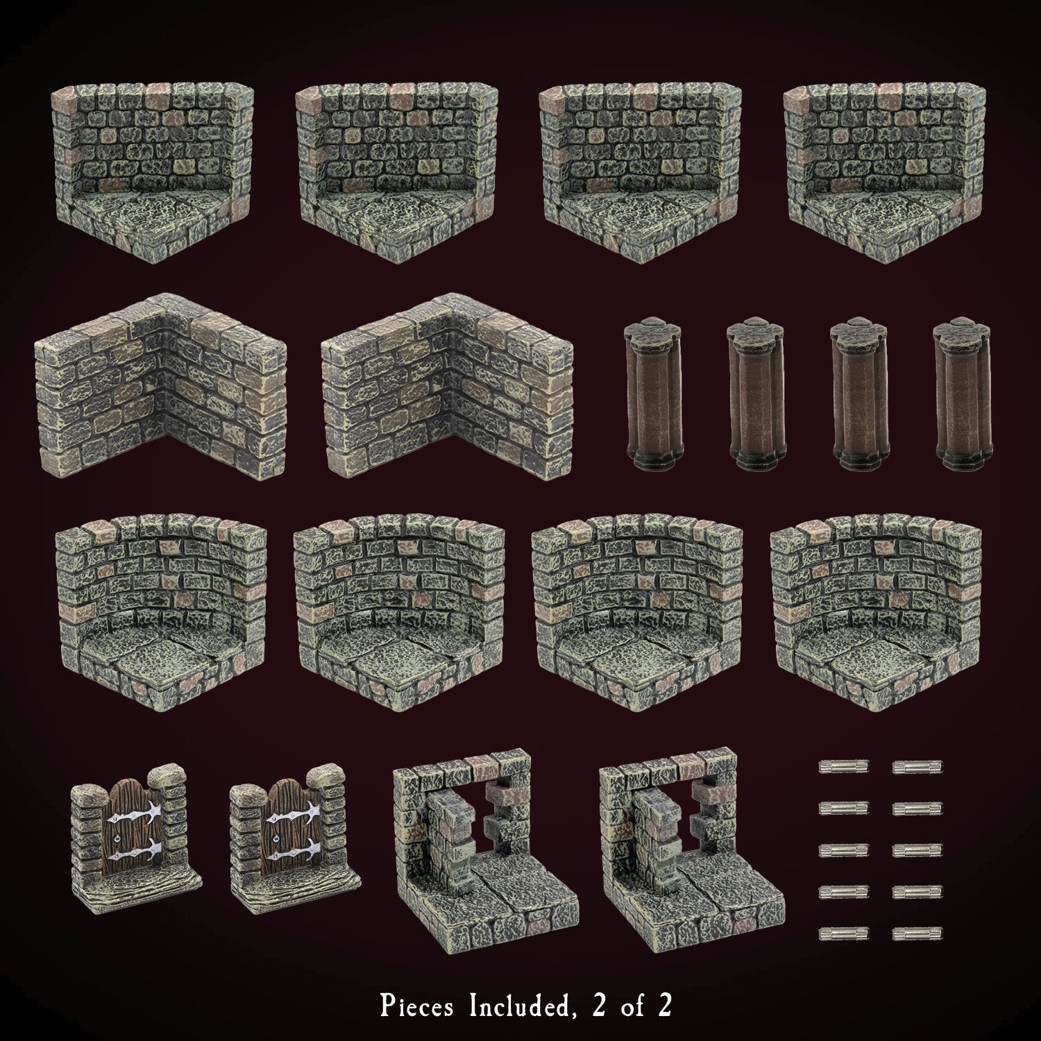Open up more building possibilities and visual style. Includes Diagonal and Curved walls for new room and corridor shapes, small pieces for technical building, and various door types for connecting rooms in interesting ways. It's topped off with a pair of our new, fully-functional Secret Door - always a crowd-pleaser at the table! This pack contains six new sculpts (Secret Door Wall, Diagonal Wall, Freestanding Arch, Descending Stairs, Dungeon Portcullis, Cornerfill Pillar) and two remastered sculpts (Curved Wall & Backfill), so it's a great way to get a good mix of the newest pieces. Sculpted in the Classic Dungeon style with plain stone walls.