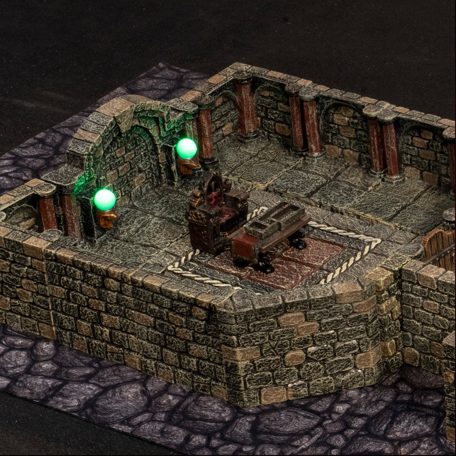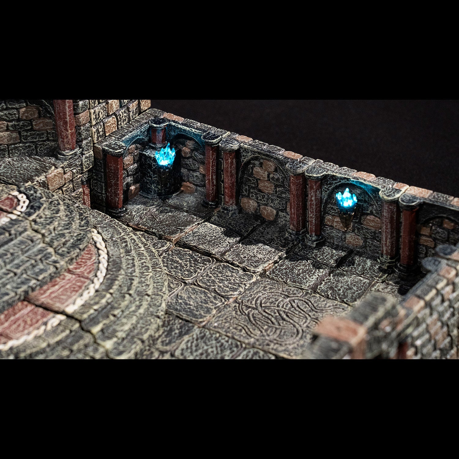 Add mood and flair to your build with glowing LED lighting effects. Featuring interchangeable LED elements, so you can swap between yellow flickering torches, bright green serpent orbs, and our brand new Ghostfire Torch for an eerie teal light. Each piece has an on/off switch on the back and a panel on the underside for the included CR2032 batteries. Sculpted in the Vaulted Dungeon style with columns and arches on the walls.