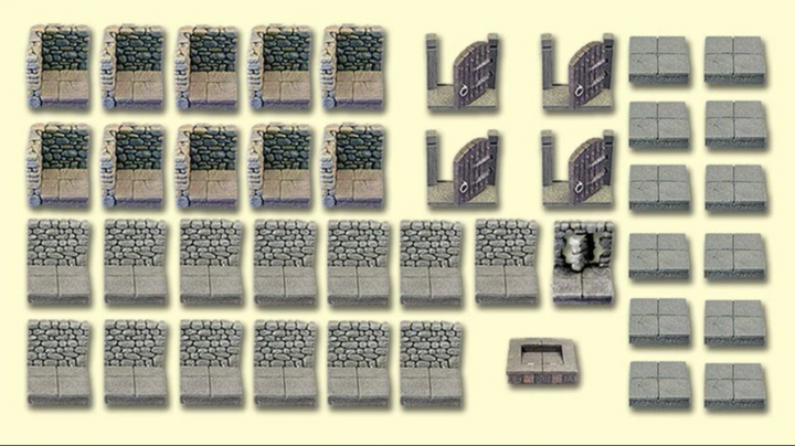 Cast in resin and hand painted, this set includes 41 pieces: 12 floor tiles 1 pit floor tile 13 straight wall sections 1 straight wall with secret door 10 corner wall sections 4 swinging doors There are no bow tie slots and no bow ties with this set.
